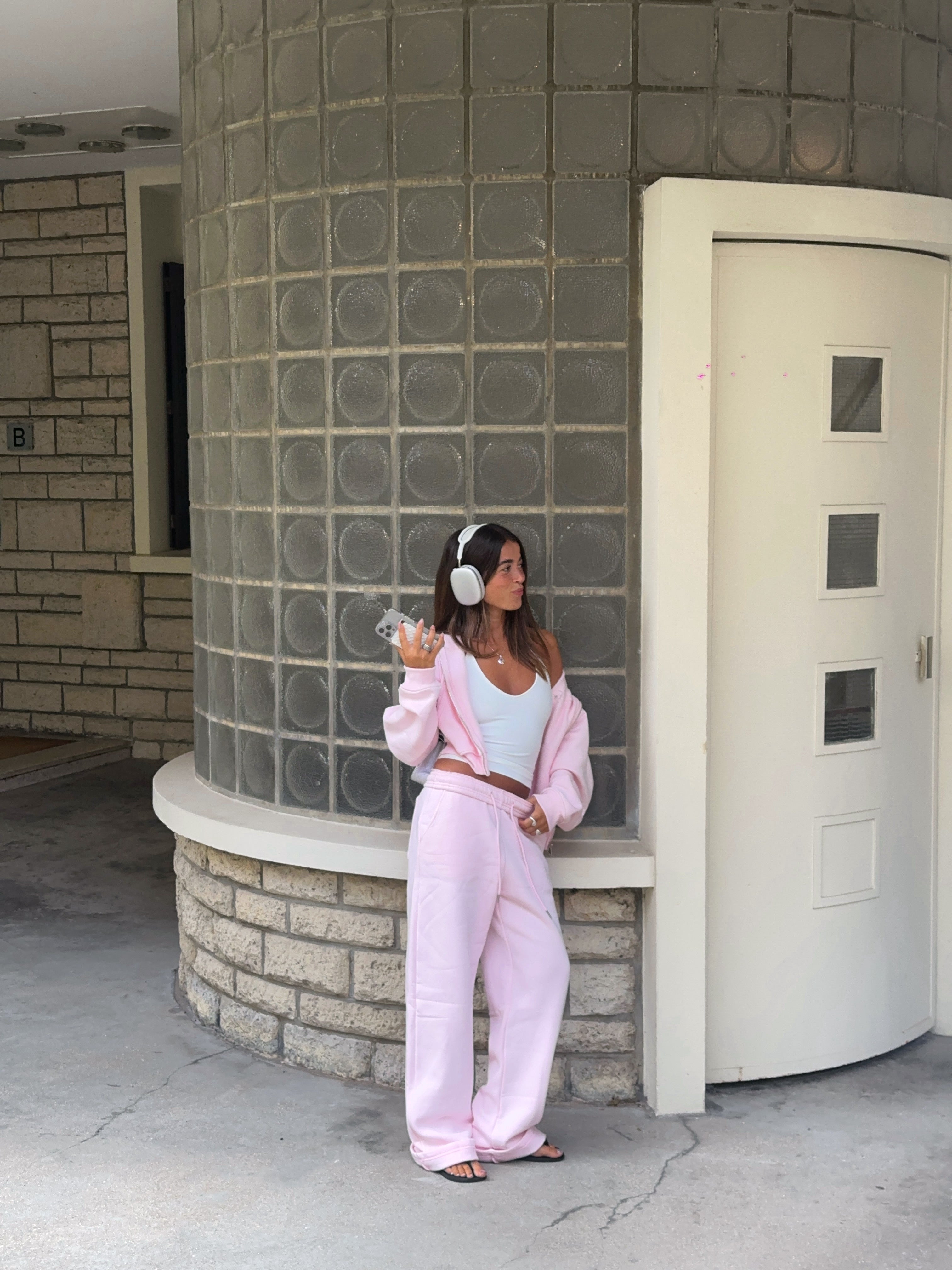 And when I just want to cozy up and chill (but still look put together), I’m all about the Wide Sweatpants and Cropped Zip Hoodie in Soft Pink, paired with the Neaty Halter Tank Top in White. Whether I’m lounging at home, walking the dog, or doing a little stretch session, this set feels like a soft hug.